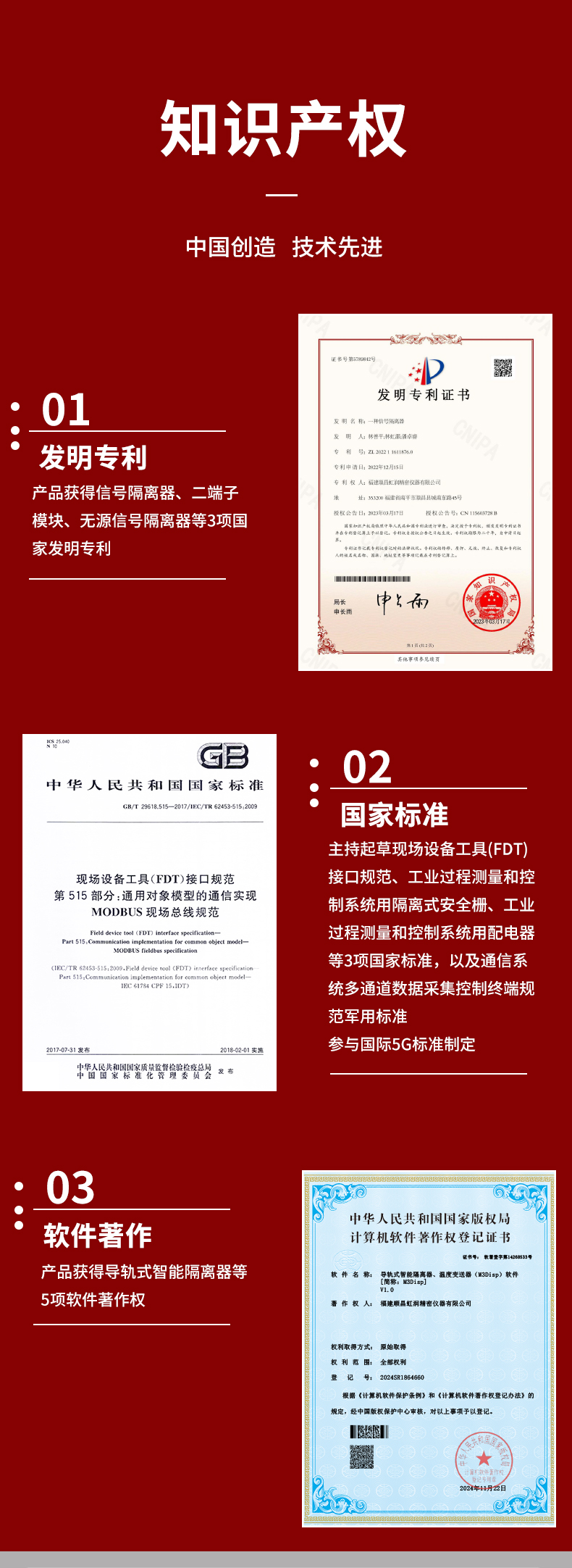 虹潤(rùn)公司是專(zhuān)業(yè)生產(chǎn)隔離器的國(guó)家專(zhuān)精特新“小巨人”企業(yè)。生產(chǎn)的智能信號(hào)隔離器涵蓋電流電壓變送器、溫度變送器、配電器、頻率轉(zhuǎn)換器、開(kāi)關(guān)量轉(zhuǎn)換器及通訊轉(zhuǎn)換器等多種產(chǎn)品類(lèi)型。產(chǎn)品獲得信號(hào)隔離器、一種二端子模塊、無(wú)源信號(hào)隔離器等3項(xiàng)國(guó)家發(fā)明專(zhuān)利,主持起草現(xiàn)場(chǎng)設(shè)備工具(FDT)接口規(guī)范、工業(yè)過(guò)程測(cè)量和控制系統(tǒng)用隔離式安全柵、工業(yè)過(guò)程測(cè)量和控制系統(tǒng)用配電器等3項(xiàng)國(guó)家標(biāo)準(zhǔn),以及通信系統(tǒng)多通道數(shù)據(jù)采集控制終端規(guī)范軍用標(biāo)準(zhǔn),參與國(guó)際5G標(biāo)準(zhǔn)制定,取得導(dǎo)軌式智能隔離器、頻率轉(zhuǎn)換器等3項(xiàng)相關(guān)軟件著作權(quán)。產(chǎn)品廣泛電力、冶金、工業(yè)電爐、變電站、高壓電機(jī)房等需要電隔離的工業(yè)自動(dòng)化控制系統(tǒng)。