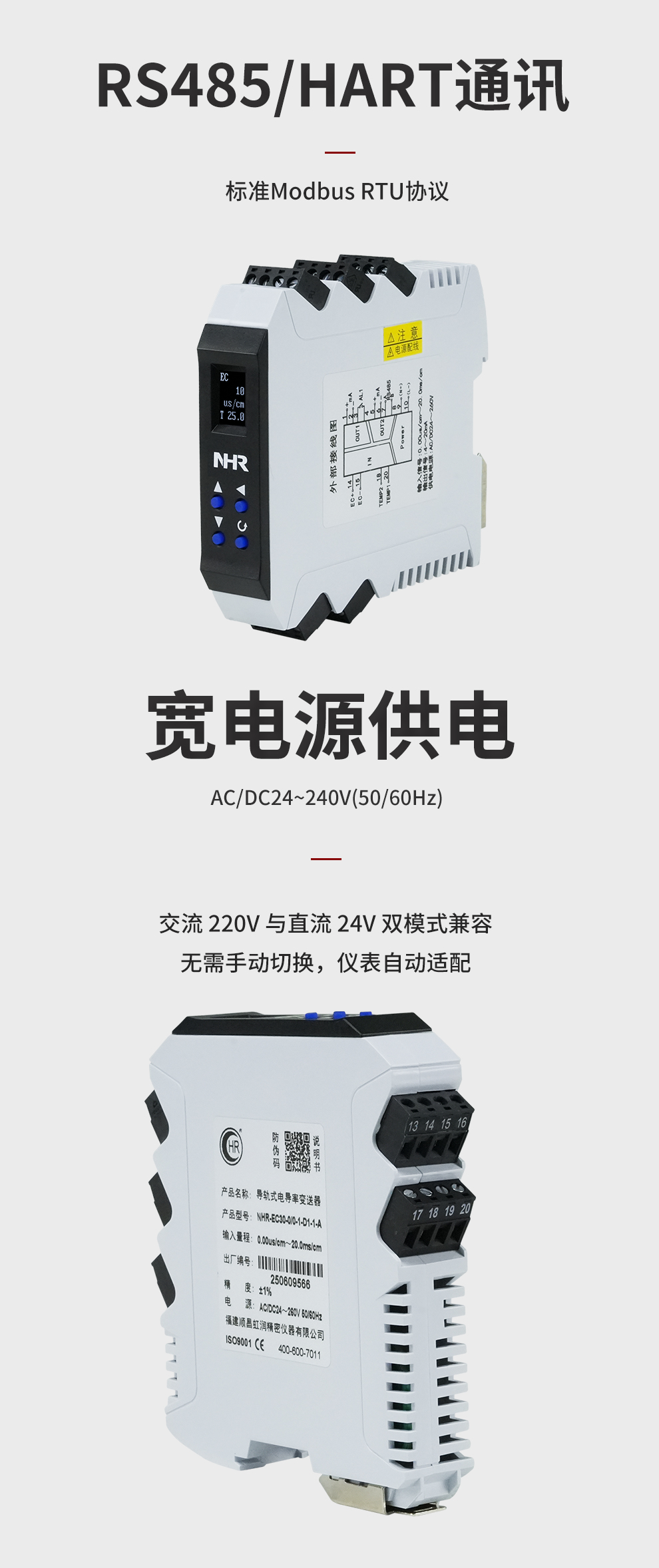 虹潤公司是專業(yè)生產(chǎn)水質(zhì)分析儀的國家專精特新“小巨人”企業(yè)。生產(chǎn)的導(dǎo)軌式電導(dǎo)率變送器,具有測量穩(wěn)定不跳字,液晶按鍵操控,變送輸出精準(zhǔn),寬范圍電源供電,RS485或HART通訊等特點(diǎn)。產(chǎn)品獲得一種信號發(fā)生裝置、智能化控制器等2項(xiàng)國家發(fā)明專利;主持起草現(xiàn)場設(shè)備集成等5項(xiàng)智能制造國家標(biāo)準(zhǔn),以及現(xiàn)場設(shè)備工具(FDT)接口規(guī)范、工業(yè)過程控制系統(tǒng)用模擬輸入兩位或多位輸出儀表、過程分析技術(shù)系統(tǒng)等3項(xiàng)國家標(biāo)準(zhǔn);參與國際5G標(biāo)準(zhǔn)制定,取得導(dǎo)軌電導(dǎo)率變送器等3項(xiàng)相關(guān)軟件著作權(quán)。產(chǎn)品廣泛應(yīng)用于實(shí)驗(yàn)室、水處理、環(huán)境監(jiān)測、制藥、食品、農(nóng)業(yè)、工業(yè)流程控制等諸多領(lǐng)域。