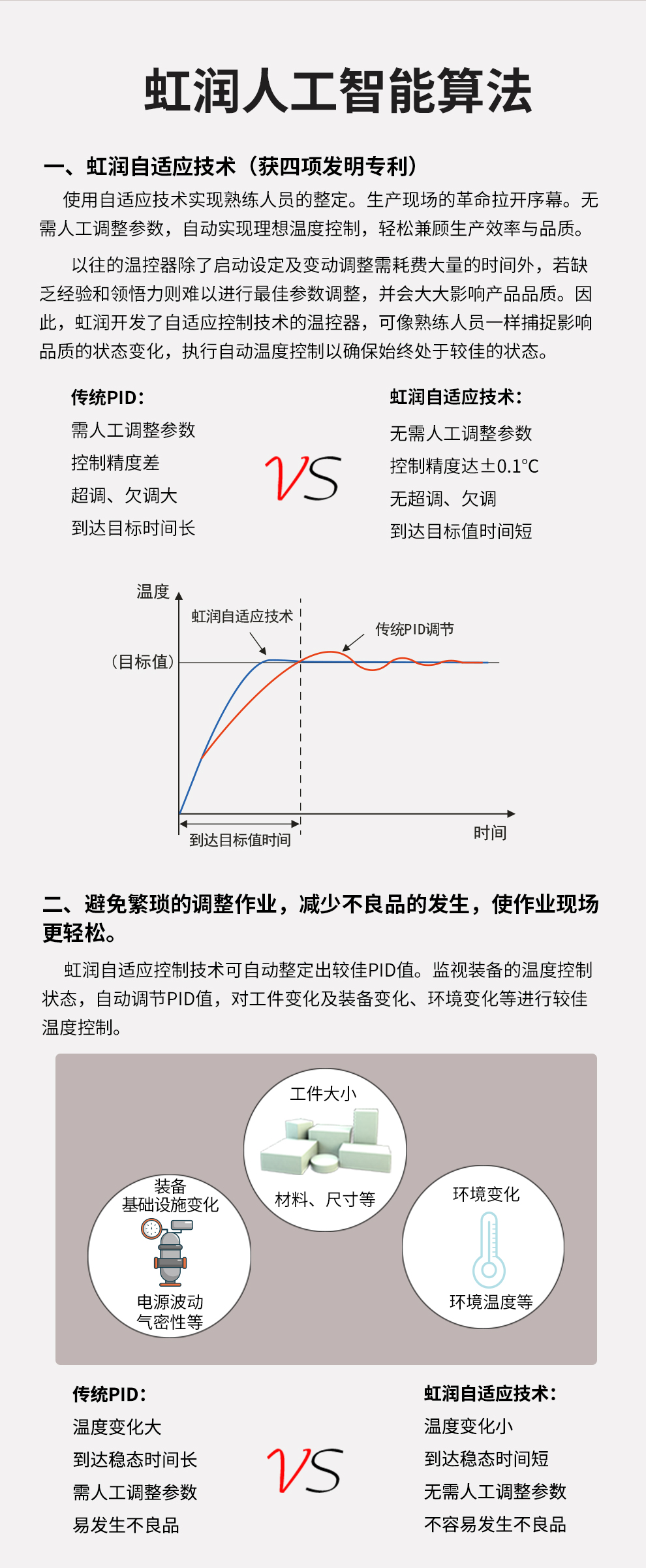 虹潤公司是專業(yè)生產(chǎn)無紙記錄儀的國家專精特新“小巨人”企業(yè)。生產(chǎn)的觸摸屏溫控器,具有觸摸大屏顯示,真正人工智能算式,無需人工整定參數(shù),控制精度達士0.1°C, RS485/以太網(wǎng)通訊,5/7/9英寸可選等特點。產(chǎn)品獲得智能化控制器、人工智能調(diào)節(jié)器及調(diào)節(jié)方法、模糊PID控制儀及控制方法、平板無紙記錄儀、巡回檢測顯示方法及裝置等5項國家發(fā)明專利,主持起草物聯(lián)網(wǎng)智能記錄儀表通用技術條件、物聯(lián)網(wǎng)智能溫度儀表通用技術條件、工業(yè)過程測量和控制系統(tǒng)用智能調(diào)節(jié)器等3項國家標準,通信系統(tǒng)多通道數(shù)據(jù)采集控制終端規(guī)范軍用標準,以及空間數(shù)據(jù)與信息數(shù)據(jù)傳輸系統(tǒng)等2項航天標準,參與國際5G標準制定,取得觸摸屏彩色調(diào)節(jié)無紙記錄儀等3項相關軟件著作權。產(chǎn)品廣泛應用于電力、石化、冶金、化工、食品、制藥、熱處理、水處理、機械配套等諸多領域。