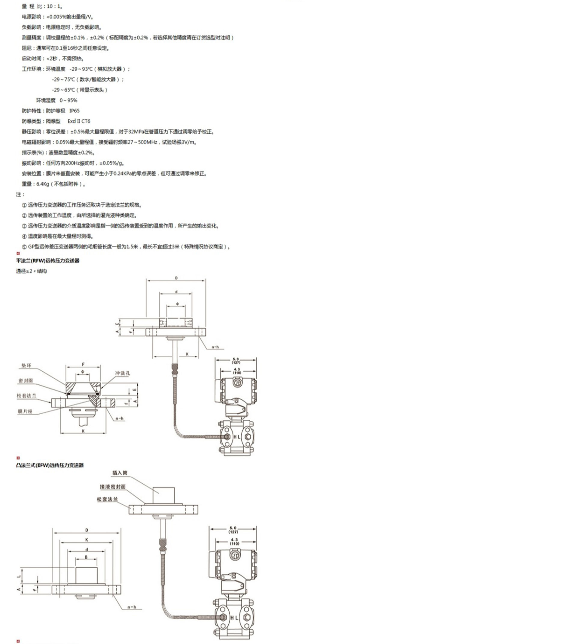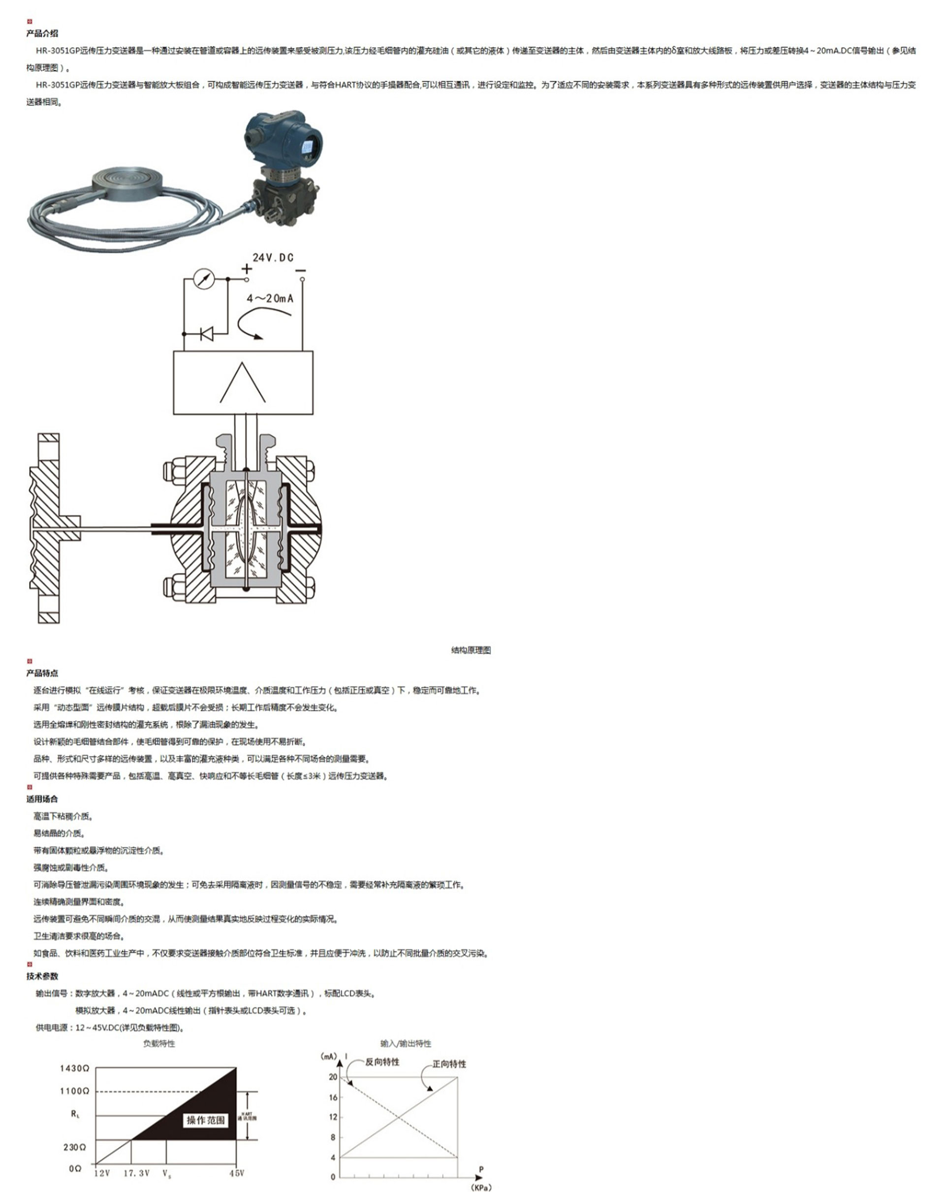 HR-3051GP遠(yuǎn)傳壓力變送器是一種通過安裝在管道或容器上的遠(yuǎn)傳裝置來感受被測壓力,該壓力經(jīng)毛細(xì)管內(nèi)的灌充硅油(或其它的液體)傳遞至變送器的主體,然后由變送器主體內(nèi)的δ室和放大線路板,將壓力或差壓轉(zhuǎn)換4~20mA.DC信號輸出。
