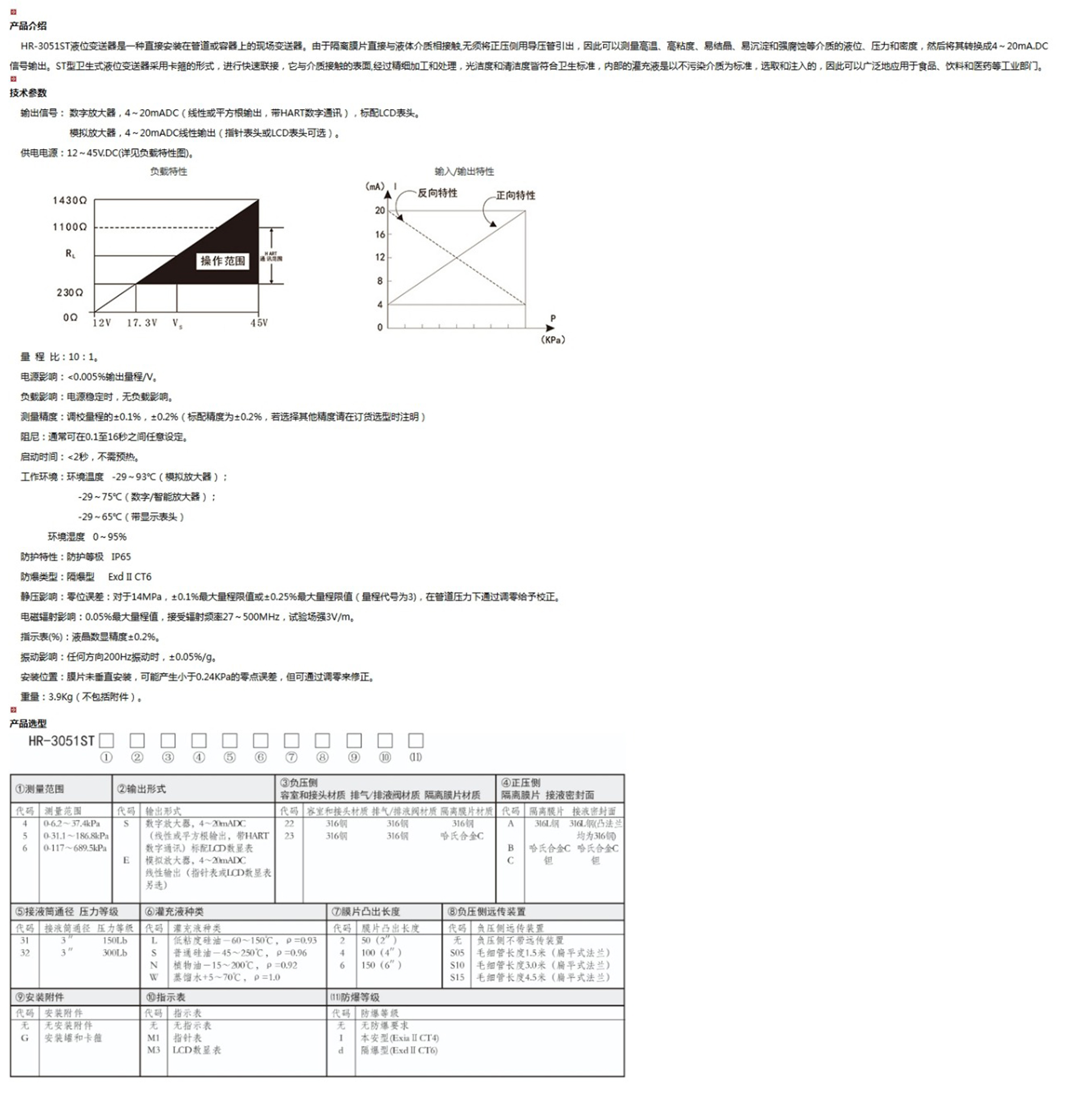 HR-3051ST液位變送器是一種直接安裝在管道或容器上的現(xiàn)場(chǎng)變送器。由于隔離膜片直接與液體介質(zhì)相接觸,無(wú)須將正壓側(cè)用導(dǎo)壓管引出,因此可以測(cè)量高溫、高粘度、易結(jié)晶、易沉淀和強(qiáng)腐蝕等介質(zhì)的液位、壓力和密度,然后將其轉(zhuǎn)換成4~20mA.DC信號(hào)輸出。